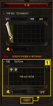 Despues de verificar el Item y hacer click en el boton "Intercambiar", podra ver un cuadro amarillo con el mensaje "Aprobacion de transaccion pendiente" tanto en tu ventana de trade como en la ventana de trade del otro personaje.