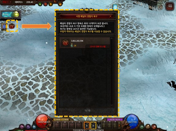 - Cuando se produce una pena de muerte, aparecera una "icono de recuperacion de punto de experiencia" en la esquina superior izquierda de la pantalla de juego. - Puedes abrir la interface de usuario de la recuperacion de puntos de experiencia a traves del icono que se muestra. - Puedes reperar los puntos de experiencia de la penalizacion haciendo click en el objeto deseado en la venta de interface de usuario. (Precaucion: si la cantidad de experiencia recuperada excede la cantidad requerida para el siguiente nivel, solo se recuperar la cantidad requerida para el siguiente nivel).